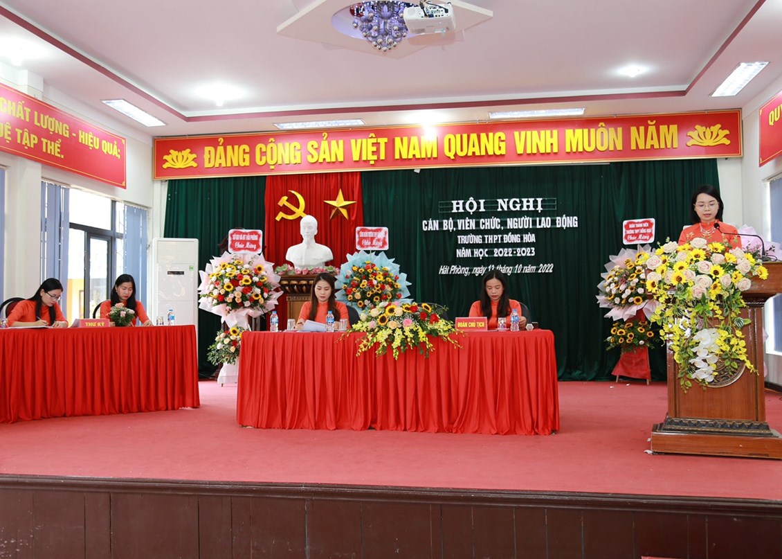 Thực hiện sự chỉ đạo, hướng dẫn của Sở GDĐT và Công đoàn Giáo dục thành phố Hải Phòng; ngày 13/10/2022, trường THPT Đồng Hòa đã tổ chức Hội nghị cán bộ, viên chức, người lao động năm học 2022-2023. Hội nghị vinh dự được đón tiếp Ông Bùi Khánh Toàn, Trưởng phòng Khảo thí & KĐCLGD cùng các Ông, Bà chuyên viên Sở GD&ĐT Hải Phòng đến dự và chỉ đạo Hội nghị.